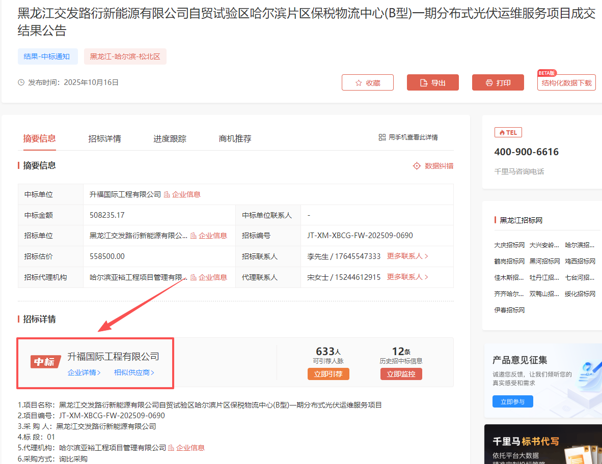 2025年10月16日,升福国际工程有限公司成功中标黑龙江交发路衍新能源有限公司自贸试验区哈尔滨片区保税物流中心(B型)一期分布式光伏运维服务项目!