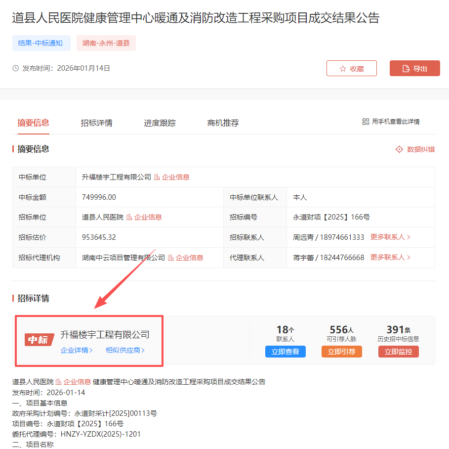 2026年1月14日,升福楼宇工程有限公司成功中标道县人民医院健康管理中心暖通及消防改造工程采购项目!